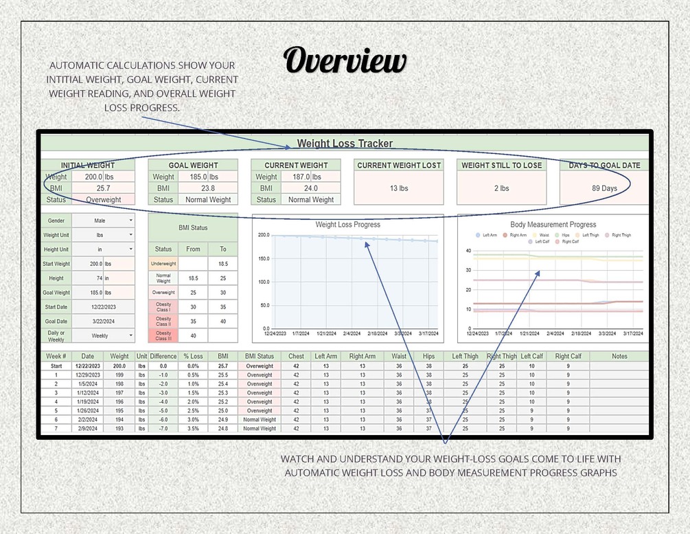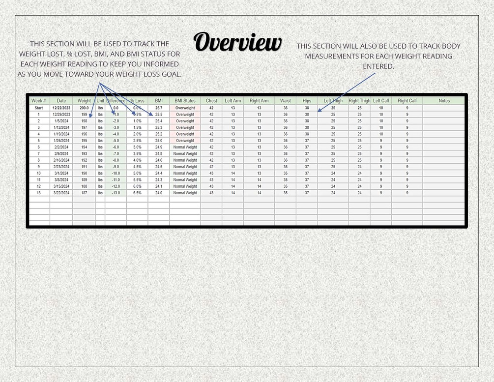 Say goodbye to the chaos of scattered weight loss management and hello to a well-organized, efficient weight loss tracking routine. Our Weight Loss Tracker will help you stay on track and help you achieve your goals with confidence.