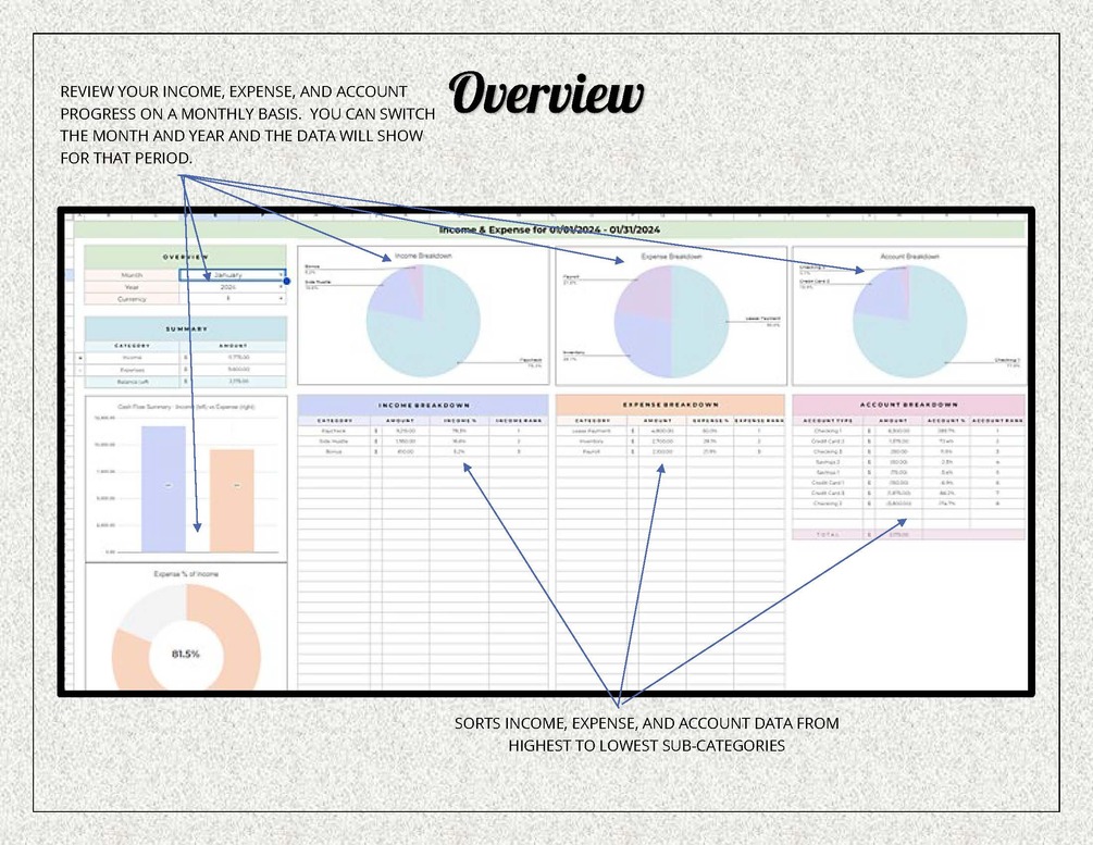 Semi-Customizable Components: Tailor your tracker to your unique needs with easy-to-adjust income, expense, and account sub-categories. It's all about flexibility!