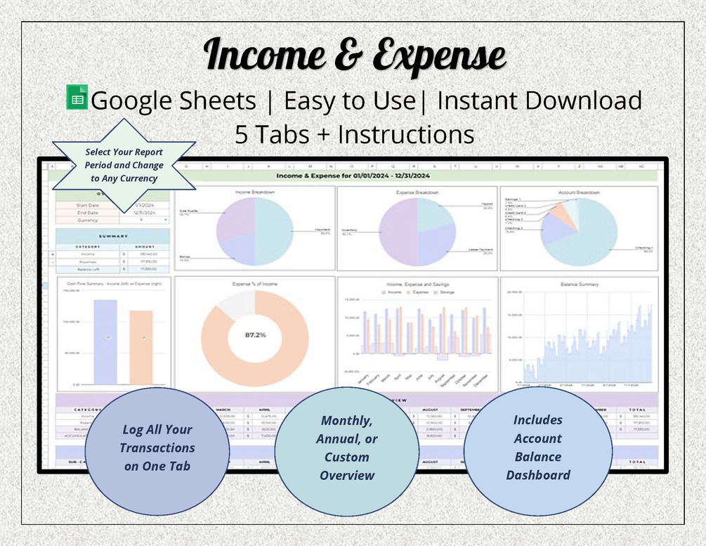 Our Google Sheets Income & Expense Tracker (5 tabs) is designed to track your total income and expenses and don't wish to set a budget. Here's what sets it apart: