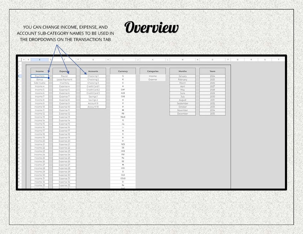 Semi-Customizable Components: Tailor your tracker to your unique needs with easy-to-adjust income, expense, and account sub-categories. It's all about flexibility!