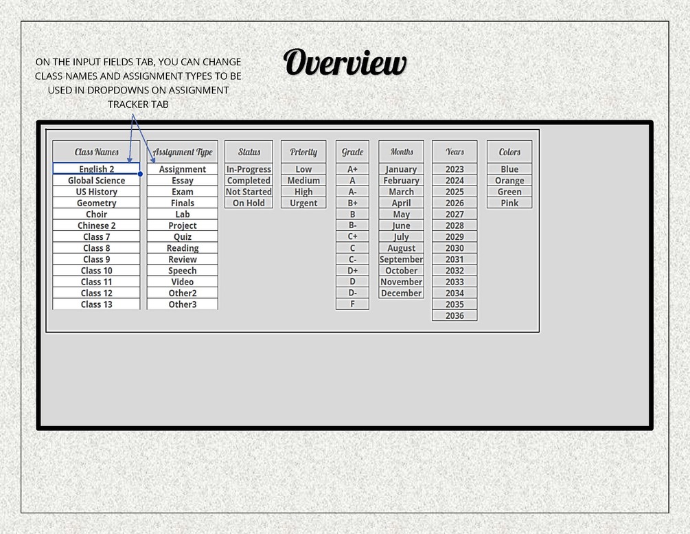 Semi-Customizable Components: Tailor your tracker to your unique needs with easy-to-adjust subjects and assignment types. It's all about flexibility!