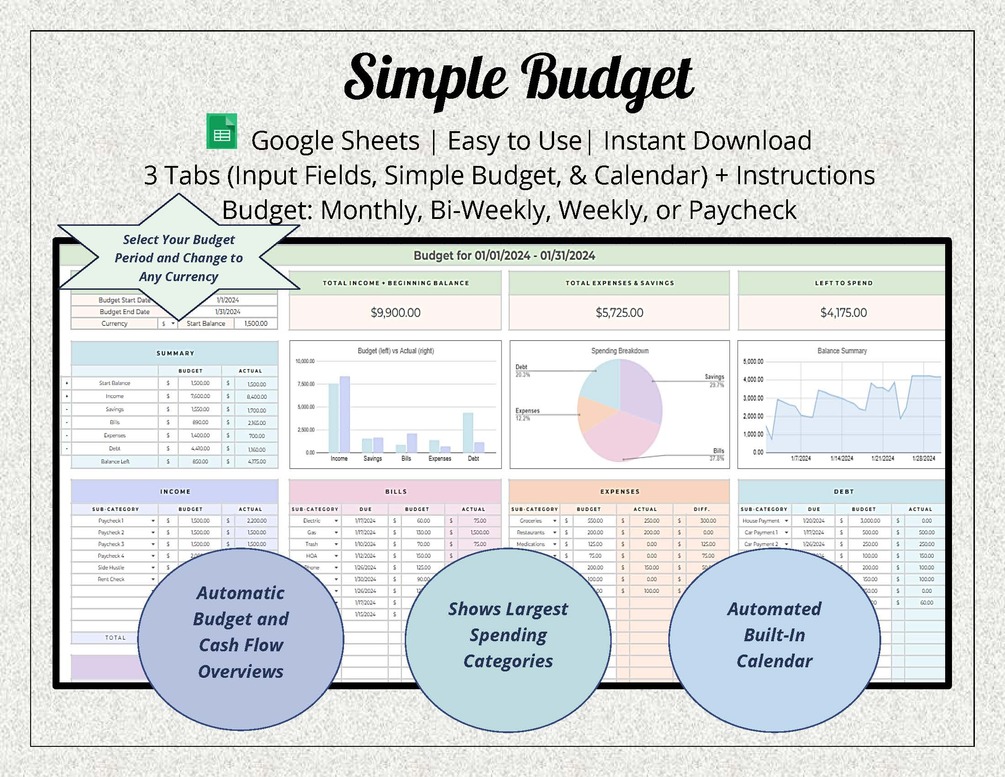 Our Google Sheets Simple Budget Spreadsheet (4 tabs) is designed to offer a seamless approach in managing your finances – perfect for both beginners and those with seasoned budget experience. Budget: monthly, bi-weekly, weekly, or paycheck. Here's what sets it apart: