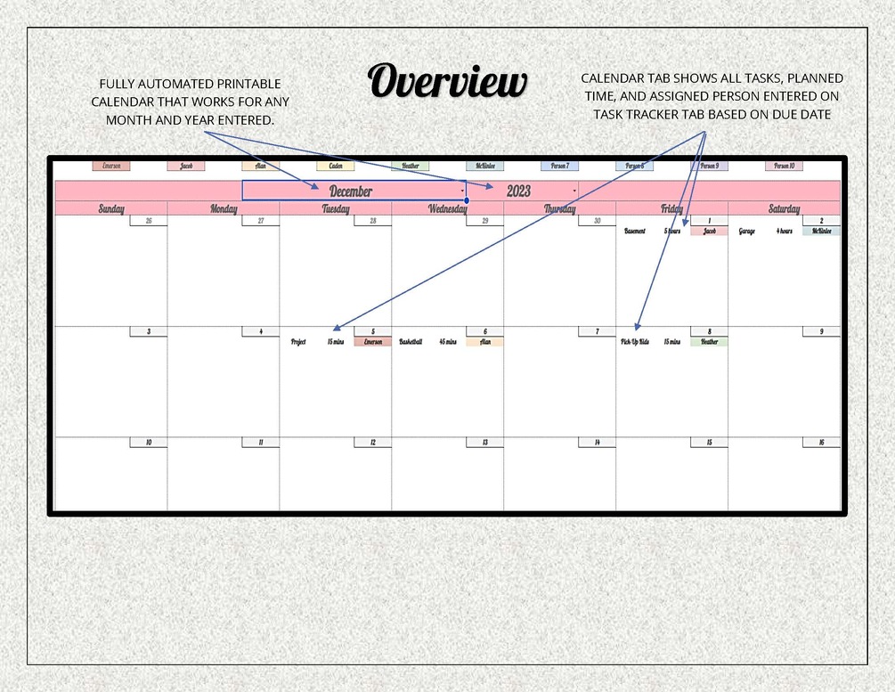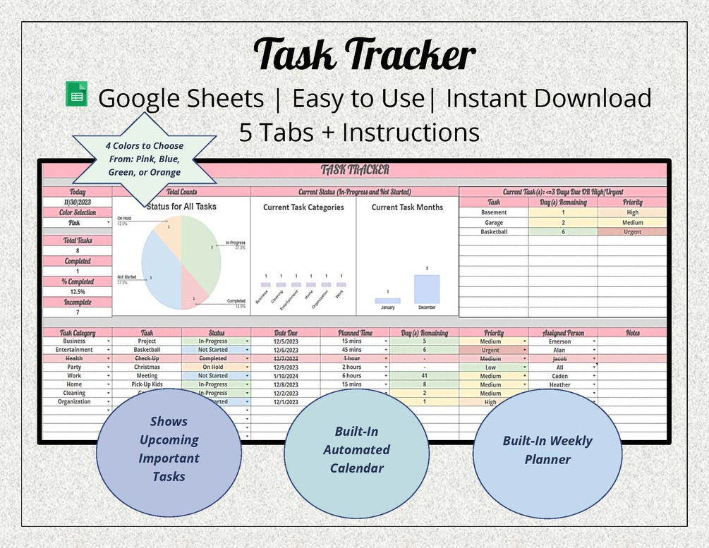 Semi-Customizable Components: Tailor your tracker to your unique needs with easy-to-adjust task categories and people assigned. It's all about flexibility!