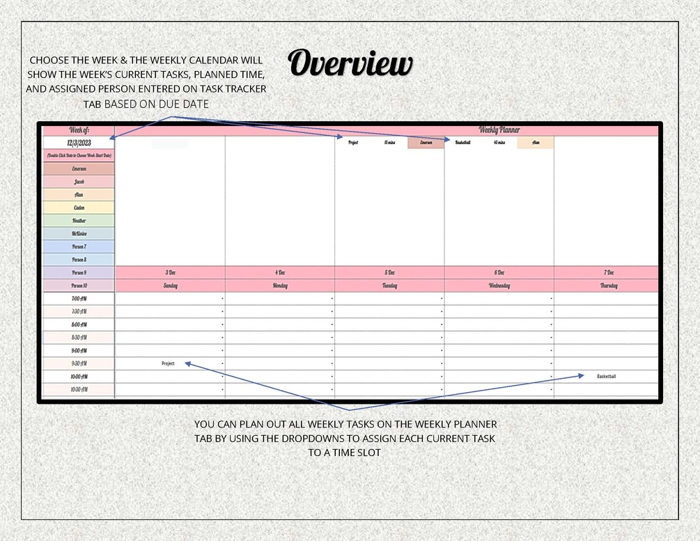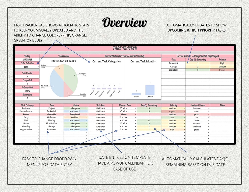 Semi-Customizable Components: Tailor your tracker to your unique needs with easy-to-adjust task categories and people assigned. It's all about flexibility!